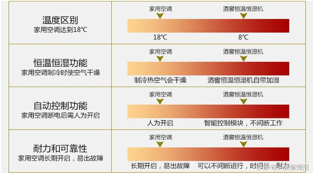 看完了上圖,答案顯而易見。家用空調(diào)的溫度無法達到酒窖的要求,無法做到恒溫恒濕,并不適宜用在酒窖當中。酒窖恒溫恒濕空調(diào)有高精度,低故障率、耐用等優(yōu)點,還能自動調(diào)節(jié)室內(nèi)溫度、濕度,這是一般家用空調(diào)不具備的。所以,為了美酒更好的儲存,還是選擇專業(yè)的酒窖恒溫恒濕機比較好。